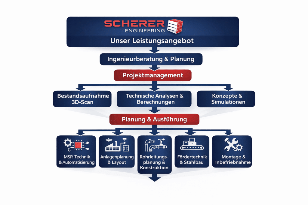 follow a clear, consistent system logic – from the initial analysis and technical design through to implementation in existing or new buildings. The diagram shows our typical approach and illustrates how individual disciplines at Scherer Engineering are interlinked.