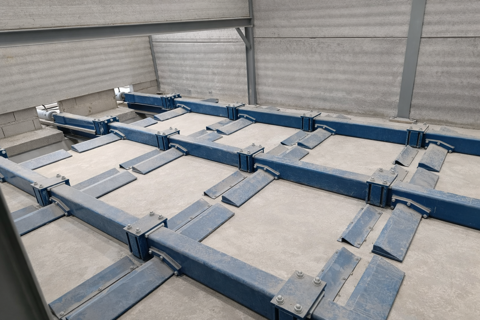 Der Zugboden besteht aus mehreren parallel angeordneten Schubrahmen, die über hydraulische Zylinder zyklisch bewegt werden. Durch definierte Hubbewegungen wird das Material schrittweise in Richtung Austrag transportiert. Die Bewegung erfolgt kontrolliert und reproduzierbar, sodass eine gleichmäßige Materialabgabe entsteht.