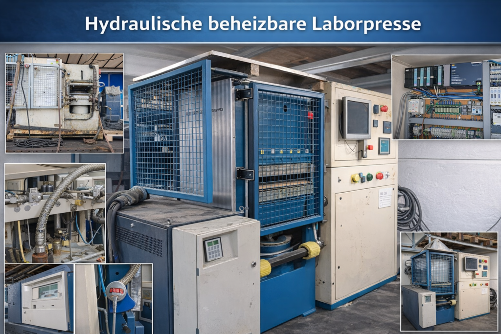 Die hydraulische, beheizbare Laborpresse dient als flexible Entwicklungs- und Versuchsanlage für thermisch aktivierte Pressprozesse unter reproduzierbaren Bedingungen. Durch die tieflochgebohrten, temperierbaren Pressplatten in Kombination mit einem externen Thermalölheizer können konstante Prozesstemperaturen bis 300 °C realisiert werden. Die mehrstufige SPS-gesteuerte Druckführung ermöglicht frei parametrierbare Presszyklen mit definiertem Druckaufbau, Haltephase und kontrolliertem Druckabbau, wobei Druck-, Weg- und Temperaturverläufe erfasst und dokumentiert werden. Die Anlage eignet sich insbesondere für die Entwicklung und Optimierung von Holzwerkstoffen wie MDF-, HDF- oder Recyclingplatten, für Binder- und Harzuntersuchungen, für Verdichtungs- und Materialanalysen sowie für Vorserien- und Pilotversuche im Bereich thermisch aktivierter Werkstoffe. Sie ist als technisch robuste Entwicklungsplattform konzipiert und ermöglicht realitätsnahe Prozessvalidierungen unter industriellen Randbedingungen, ohne auf Serienproduktion ausgelegt zu sein. Eine weiterführende Industrialisierung bis hin zur CE-konformen Versuchsanlage ist auf Basis eines bereits ausgearbeiteten Rebuild-Konzepts möglich.