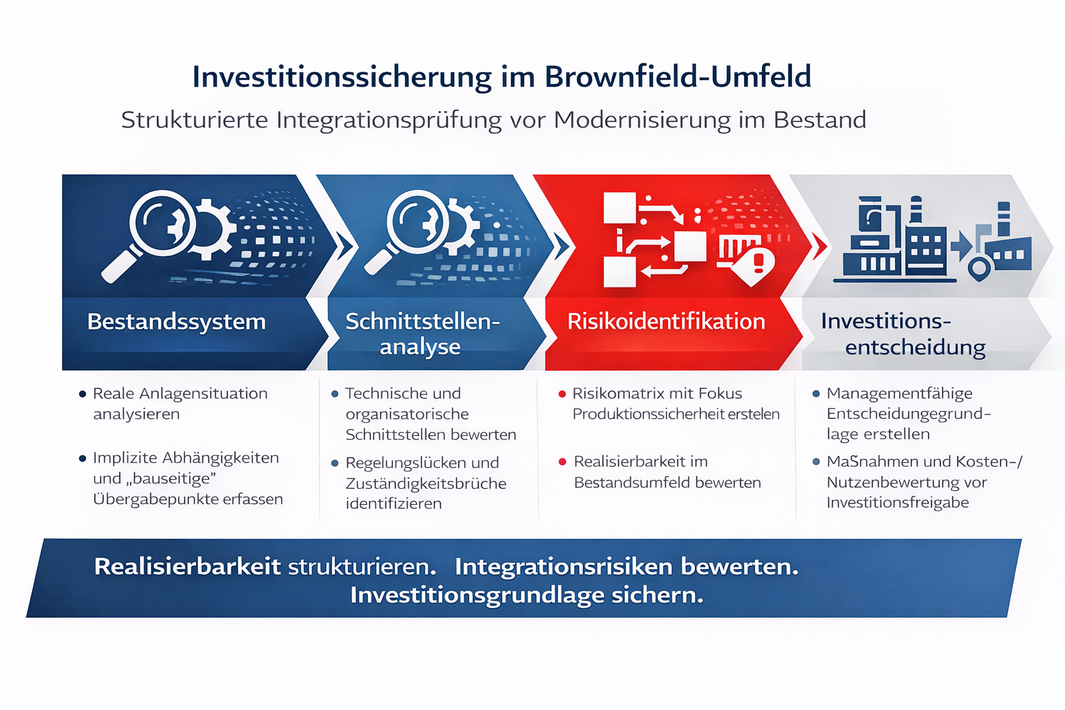 Strategisches Erstgespräch zur Investitionssicherung Modernisieren im Bestand ist kein Technikproblem.Es ist ein Integrationsproblem.Strukturierte Investitionssicherung vor Retrofit- und Modernisierungsprojekten. Erstgespräch vereinbaren DAS PROBLEMTypische Risikofaktoren:Implizite SystemabhängigkeitenUnklare Leistungsgrenzen („bauseitig“)Gewerkeübergreifende SchnittstellenEingriffe in laufende ProduktionUnterschätzte StillstandsfolgenDie höchsten Projektkosten entstehen nicht in der Planung,sondern in Nacharbeit und Terminverschiebung. DAS INSTRUMENTDie Brownfield-Integrationsprüfung bewertet das Projekt als Gesamtsystem – nicht als Summe einzelner Gewerke.Ziel:Transparenz kritischer IntegrationspunkteRealisierbarkeitsprüfung im BestandStrukturierte RisikobewertungManagementfähige EntscheidungsgrundlageDie Leistung ersetzt keine Planung.Sie sichert sie ab. STRUKTUR & LAUFZEITTypischer Projektzeitraum: 6–8 Wochen.Phasen:KontextklärungSchnittstellenanalyseRisikobewertungRealisierbarkeitsprüfungMaßnahmenkatalogEntscheidungsaufbereitungProjektbezogene Anpassung möglich. FACHLICHE VERANTWORTUNGDie Durchführung erfolgt persönlich durch Dirk Scherer.Direkte Einbindung.Keine Delegation.Individuelle Priorisierung. Sie planen eine Modernisierung im Bestand?Ein strukturiertes Erstgespräch klärt die Relevanz. Erstgespräch vereinbaren
