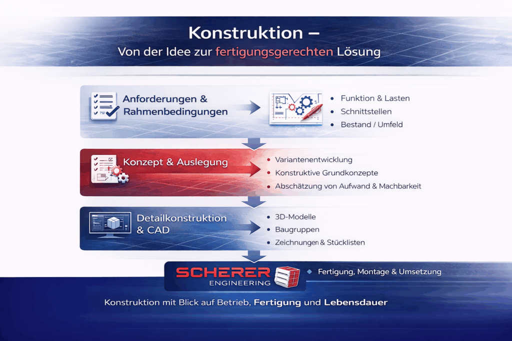 verstehen wir als die konsequente Übersetzung technischer Anforderungen in funktionierende, fertigungsgerechte Lösungen. Im Mittelpunkt stehen dabei nicht nur Geometrie und Zeichnungen, sondern auch Montage, Betrieb, Wartbarkeit und das Zusammenspiel aller beteiligten Systeme.